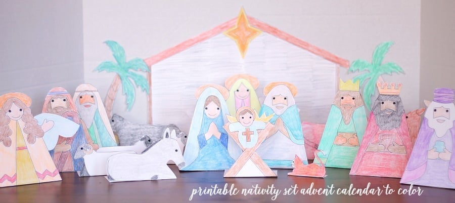 Truly enter into Advent this year as a family with this printable Nativity Advent Calendar ready for the kids to color. All of the characters are here: Mary, Joseph, Jesus, 3 Kings, 2 Shepherds, 3 Camels, 3 Sheep, 2 Cows, a Cat, a donkey, 2 Angels, 2 Trees, a Stable, a Manger, and a star.